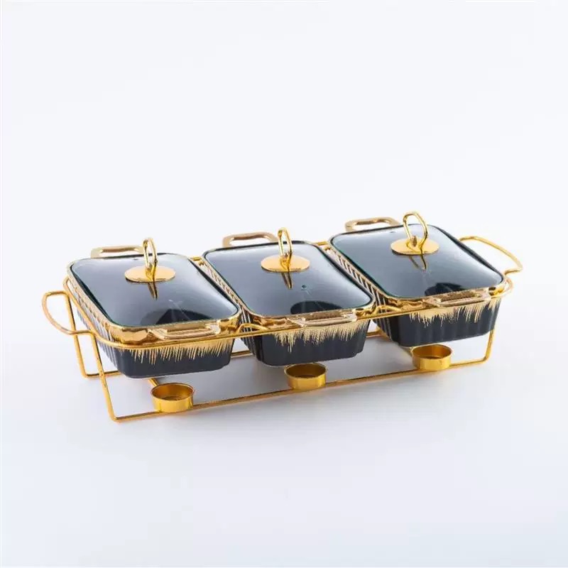3-Compartment Black Ceramic Food Warmer with Gold Stand